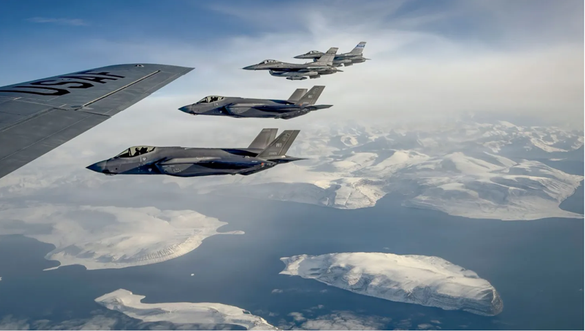 (In foto: F-35 Lightning II del North American Aerospace Defense Command con il 115° Fighter Wing della Wisconsin Air National Guard, F-16 Fighting Falcon con il 169° Fighter Wing della South Carolina Air National Guard e un KC-135 Stratotanker con il 128° Air Refueling Wing della Wisconsin Air National Guard sorvolano la Groenlandia, il 7 ottobre 2025)