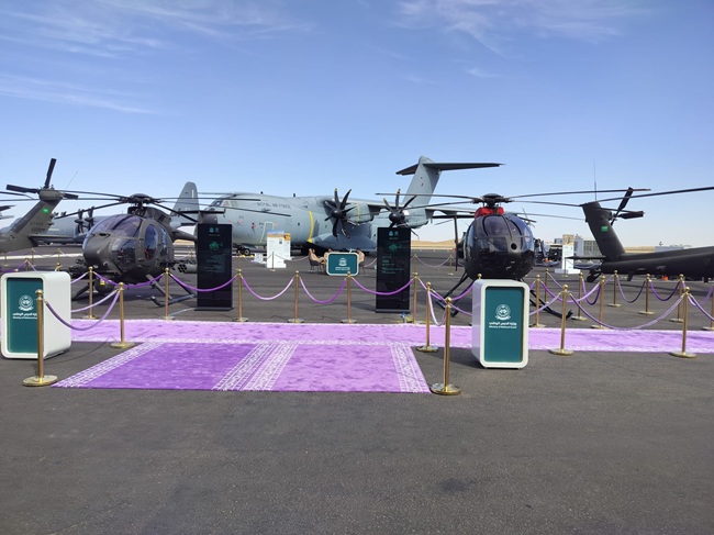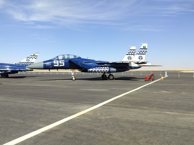Il build-up delle forze statunitensi nell’area va avanti e il dispositivo oggi è bello robusto: sia per ciò che concerne le difese antiaeree e antimissile, pesantemente potenziate dopo la Guerra dei 12 Giorni, con nuovi THAAD e PATRIOT dispiegati nelle ultime settimane a protezione di basi e obiettivi sensibili, sia per ciò che concerne il potenziale d’attacco: la portaerei LINCOLN, almeno 10 cacciatorpedinere e 2 sottomarini nucleari, uno Stormo di F-15, molti tanker, gli F-35 e i 3 BACN, ecc. Vedremo che succederà: dispiegare tutte queste forze solo per far pressione, per poi richiamarle, è certamente in linea con il motto dell’Amministrazione Trump “pace attraverso la forza”, ma è innegabile che per far pressione bastava anche meno... Detto ciò, veniamo al salone. Quest'ultimo è cresciuto come detto ancora rispetto a 2 anni fa: è stata aggiunta una quarta hall, creato uno spazio ad hoc per i droni, e adesso è presente pure una statica di tutto rispetto, probabilmente anche più ricca di quella del Dubai Air Show. Diversi i velivoli dell’USAF in mostra, ma la protagonista è ovviamente l’Aeronautica Saudita: bombardieri tattici TORNADO e caccia pesanti F-15, alcuni dei quali in mostra con livree particolari, come, per esempio, quella blu per il 95° anniversario della fondazione del Regno (in foto), e, decisamente una chicca, un esemplare di scout armato AH-6i della SANG (Saudi Arabia National Guard).